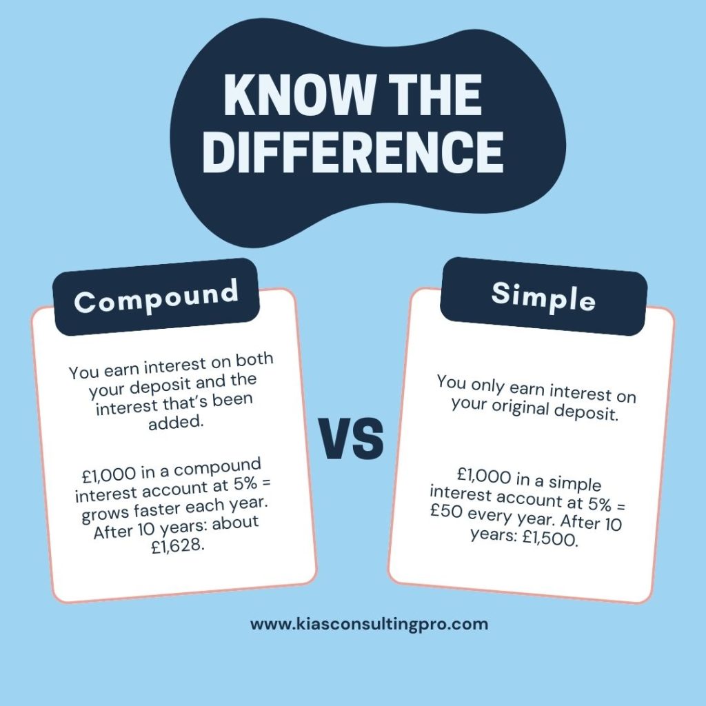 - Compound interest: You earn interest on both your deposit and the interest that’s been added.